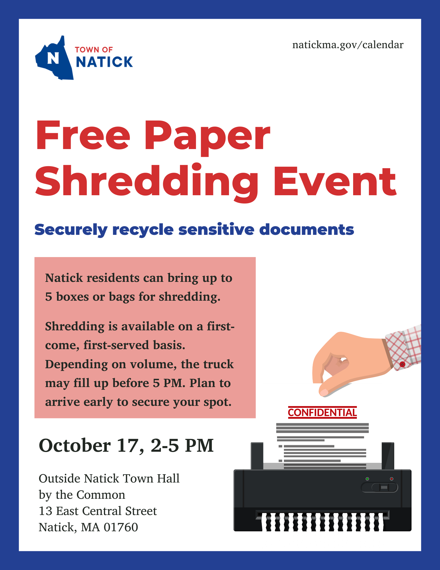 Natick residents can bring up to 5 bags or boxes for shredding.
